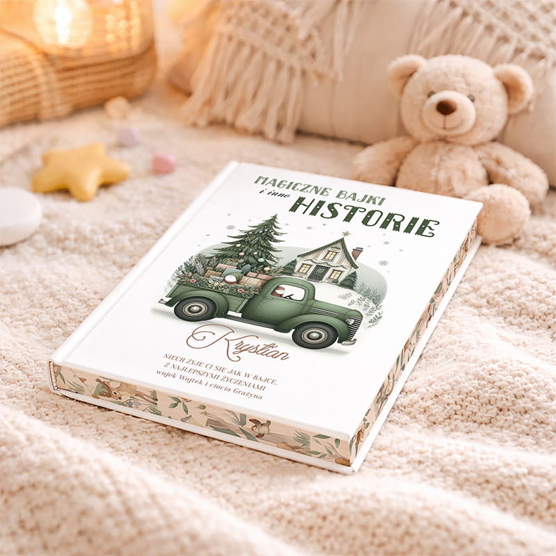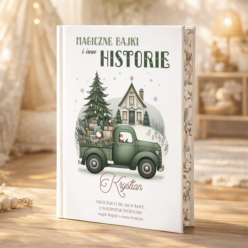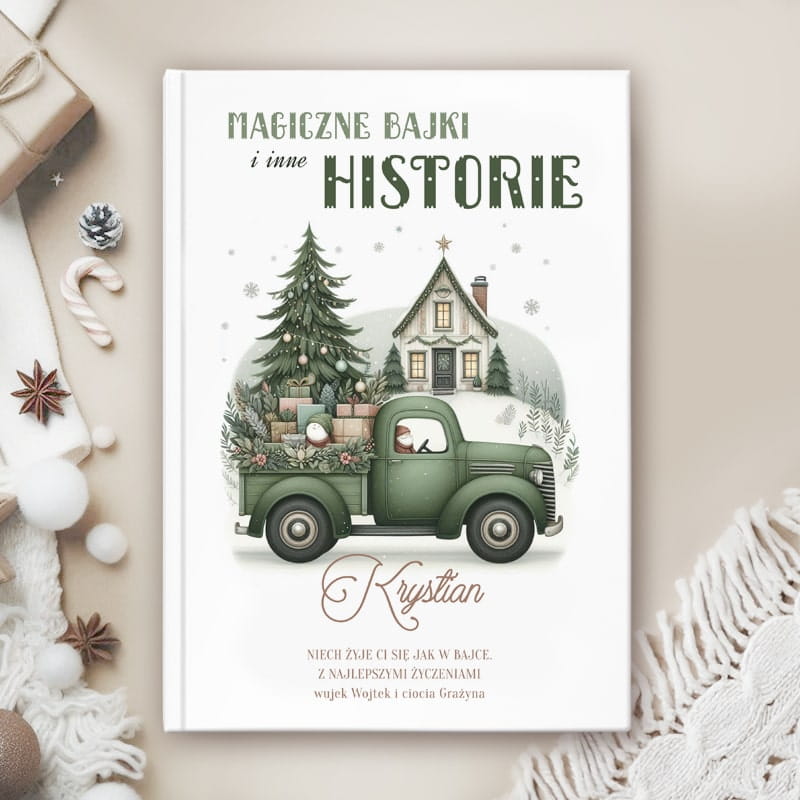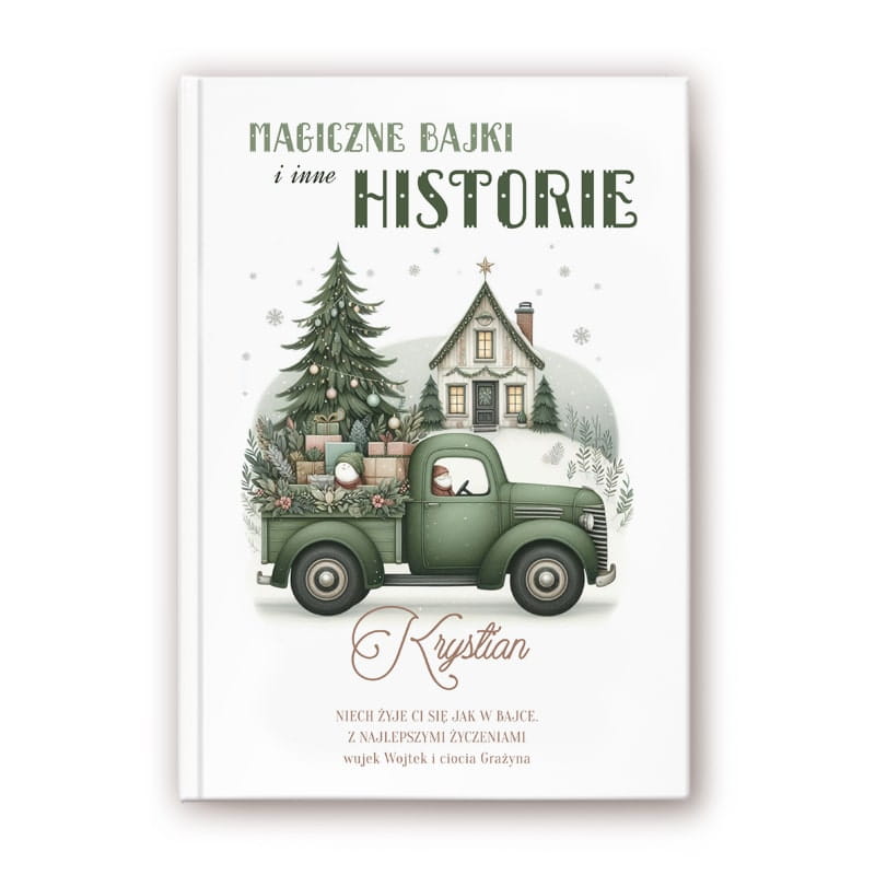Personalizowana książka „Magiczne bajki i inne historie” to wyjątkowa propozycja świąteczna, która łączy w sobie ciepło opowieści z urokiem zimowych ilustracji. Na okładce centralne miejsce zajmuje imię dziecka, a poniżej znajduje się dedykacja od osoby wręczającej prezent: „Niech żyje Ci się jak w bajce. Z najlepszymi życzeniami…”, co nadaje książce osobistego charakteru. Całość utrzymana jest w klimacie Bożego Narodzenia – grafika przedstawia zieloną ciężarówkę wypełnioną prezentami i choinką, zaparkowaną przed przytulnym, ośnieżonym domkiem ozdobionym świątecznymi dekoracjami. Świąteczna grafika, kolory i dbałość o detale sprawiają, że książka wprowadza w bajkowy, zimowy nastrój.