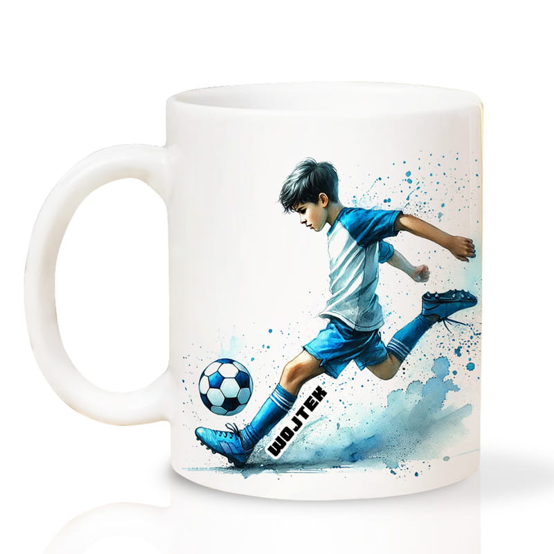 Personalizowany kubek dla piłkarza z personalizacją imienia to doskonały i praktyczny prezent dla każdego młodego sportowca, który kocha futbol. Na zdjęciu przedstawiony jest biały, ceramiczny kubek z dynamiczną grafiką chłopca kopiącego piłkę nożną w niebieskim stroju sportowym. Na nodze zawodnika znajduje się imię dziecka, co nadaje kubkowi osobisty i unikalny charakter.