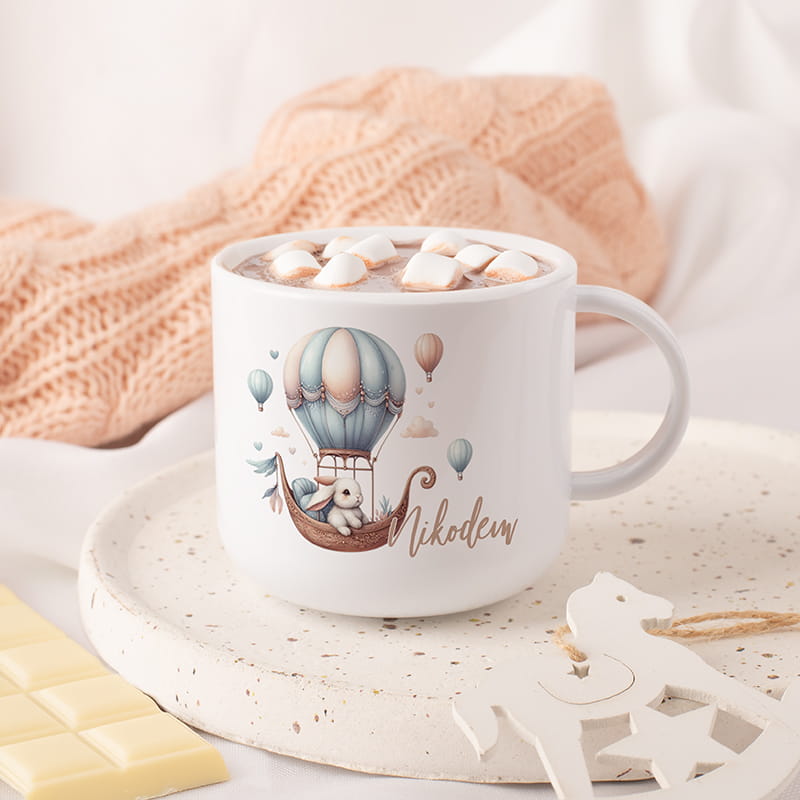 Na kubku widnieje uroczy króliczek siedzący w gondoli unoszonej przez pastelowy balon, a wokół pojawiają się mniejsze baloniki i obłoczki. Całość utrzymana w delikatnej kolorystyce błękitu i beżu tworzy przyjazny, bajkowy klimat. Imię dziecka nadrukowane na kubku sprawia, że każdy egzemplarz jest jedyny w swoim rodzaju. Kubek ma odpowiednią pojemność, a jego wygodne ucho ułatwia trzymanie w małych rączkach. Jest praktyczny do codziennego użytku – można w nim podać mleko, kakao, wodę czy ulubiony sok dziecka. To świetny pomysł na prezent dla malucha – na przykład jako prezent na rozpoczęcie przedszkola czy szkoły.