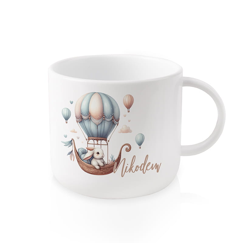 Nietłukący się kubek z imieniem i uroczą grafiką króliczka w pastelowym balonie to praktyczny i piękny prezent dla dziecka – idealny do domu, szkoły i przedszkola.