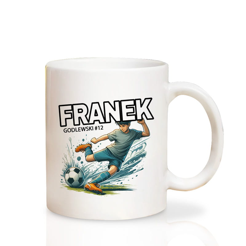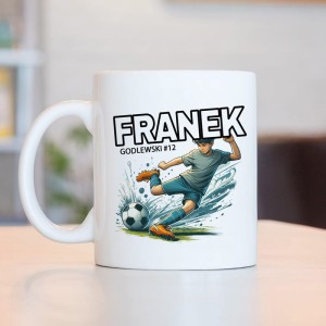 Kubek z imieniem to trafiony prezent dla fana piłki nożnej, który z dumą kibicuje ulubionej drużynie lub sam gra w klubie. Dynamiczna ilustracja zawodnika oddającego strzał na bramkę przyciąga uwagę i idealnie wpisuje się w piłkarską stylistykę. Możliwość personalizacji – imię, nazwisko oraz numer gracza sprawia, że kubek staje się wyjątkowy i dopasowany do konkretnej osoby.