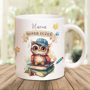 Personalizowany kubek z nadrukiem dla Pierwszaka to wyjątkowy prezent na pasowanie na ucznia. Praktyczna pamiątka z imieniem i grafiką sowy, idealna na szkolny start.