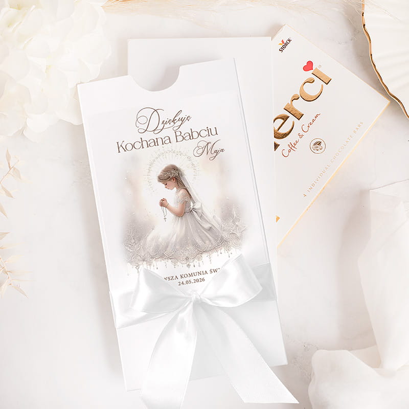 Merci podziękowanie komunijne dla dziadków od dziewczynki to wzruszający prezent w eleganckiej formie. Personalizowane opakowanie z grafiką dziewczynki i słodką zawartością zachwyca i pozostaje w pamięci.
