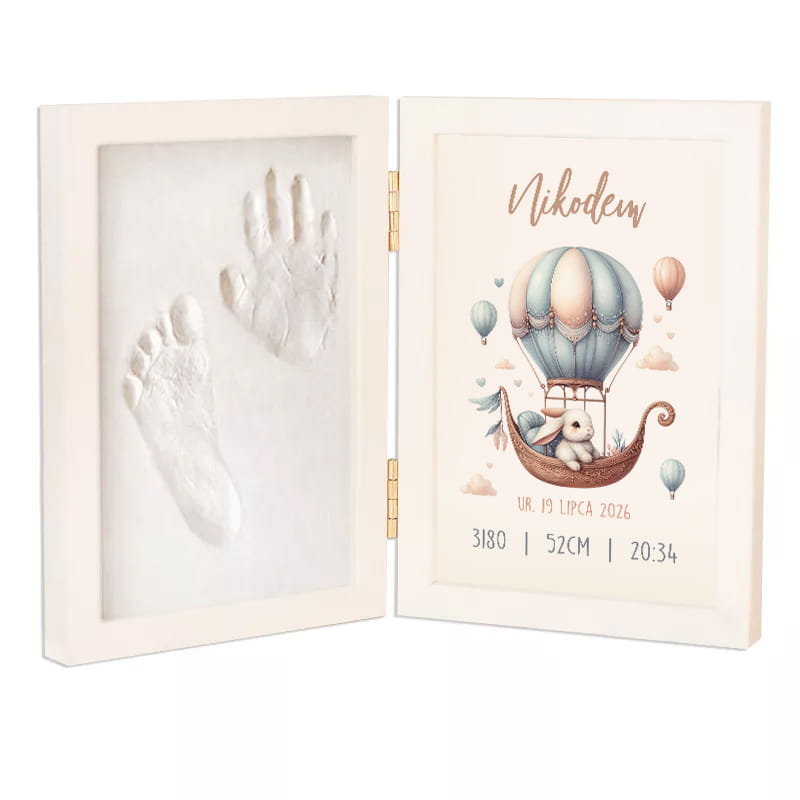 Po drugiej umieszczono metryczkę z najważniejszymi danymi narodzin – imieniem, datą, godziną, wagą i wzrostem maluszka. Całość zdobi subtelna grafika króliczka podróżującego w ozdobnej gondoli balonu, w pastelowych barwach błękitu i jasnego różu. Delikatne baloniki i obłoczki wokół ilustracji nadają jej bajkowego uroku, który idealnie pasuje zarówno dla chłopca, jak i dziewczynki. To niezwykły prezent na narodziny dziecka, który wyróżnia się spośród klasycznych upominków, dzięki personalizacji. Taki upominek można podarować podczas pierwszych odwiedzin u maluszka. Ramka z pewnością zostanie doceniona przez świeżo upieczonych rodziców, którzy zyskają piękną pamiątkę.