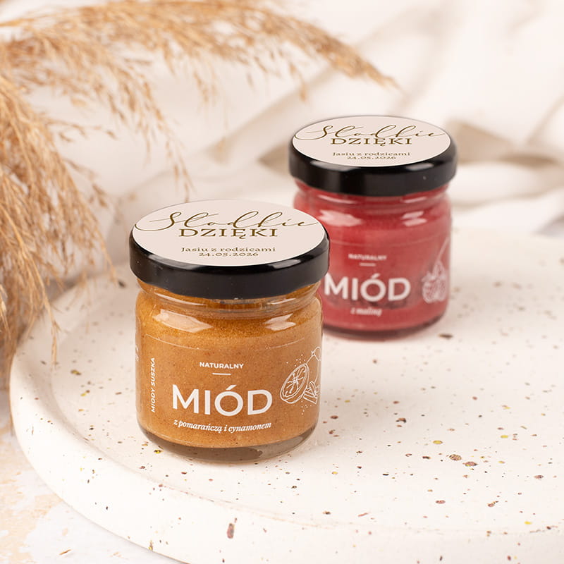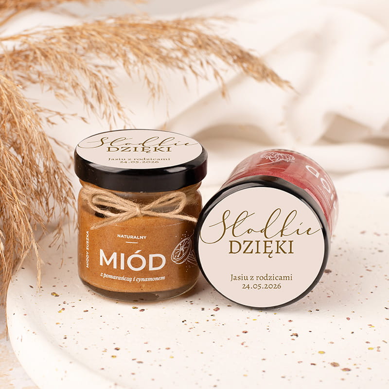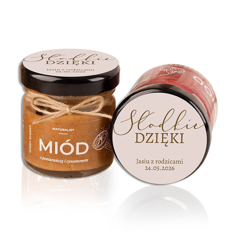 Miód smakowy w małym słoiczku podziękowanie od dziecka 10szt to słodki i estetyczny upominek przygotowany z myślą o gościach uczestniczących w uroczystości. Każdy słoiczek zawiera naturalny miód z dodatkiem aromatycznych składników, miodki wysyłane są jako mix w różnych, pysznych smakach. Nakrętka udekorowana jest etykietą z napisem „Słodkie Dzięki”, imieniem dziecka i datą wydarzenia, co nadaje całości indywidualnego charakteru i tworzy pamiątkę uroczystości.