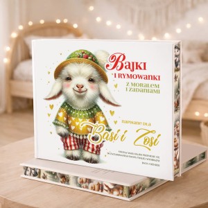 Na okładce widnieje tytuł „Bajki i rymowanki”, poniżej personalizacja w postaci imienia dziecka, a całość uzupełnia cytat: „Niechaj magia bajek przeniesie Cię do zaczarowanego świata Twojej wyobraźni” oraz podpis od osoby wręczającej prezent – np. „Babcia i Dziadek”. Grafika przedstawia uroczego koziołka w pastelowym, świątecznym stroju, otoczonego serduszkami i ciepłymi detalami, które od razu wprowadzają w radosny klimat Bożego Narodzenia.