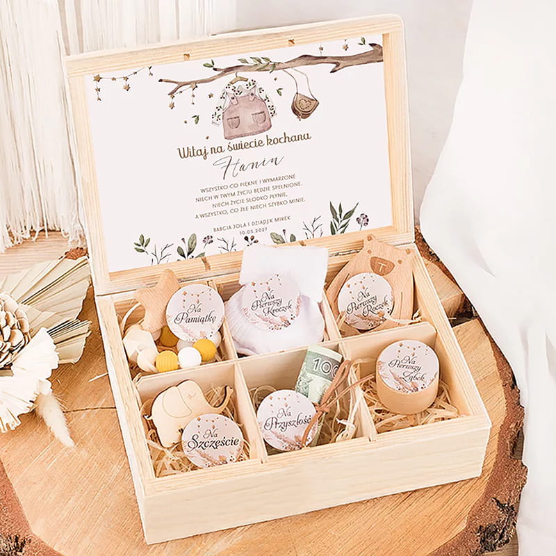 Wieko szkatułki zdobi wklejka z grafiką w stylu boho, przedstawiająca dziewczęce ubranko zawieszone na gałązce, torebeczkę i złote gwiazdki w otoczeniu roślinnych zdobień. Na tej samej karcie umieszczane są również życzenia z personalizacją – zawierają imię dziecka, tekst powitalny, imiona osób wręczających podarunek oraz datę uroczystości. Pudełko zachowane jest w naturalnym, jasnym odcieniu drewna. Dzięki temu całość prezentuje się elegancko i subtelnie, a jednocześnie utrzymana jest w nowoczesnej, boho stylistyce. Taki upominek świetnie sprawdza się jako pamiątka wręczana z okazji narodzin dziecka lub pierwszej wizyty u noworodka.