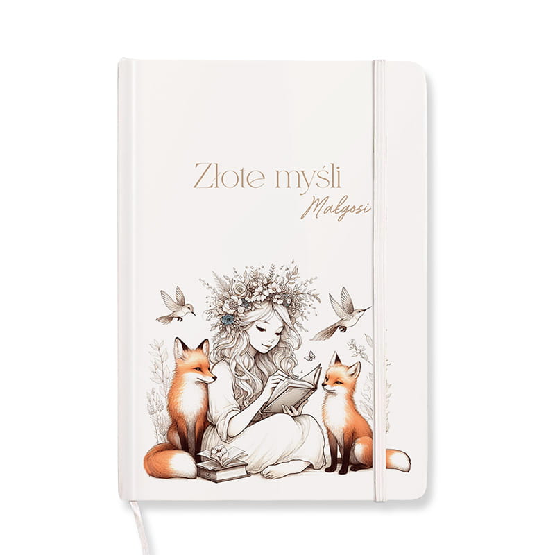 Personalizowany notatnik z imieniem dziecka na złote myśli to wyjątkowy prezent dla dziewczynki. Piękna okładka z liskami i wiankiem, trwała oprawa i osobisty charakter – idealny prezent pełen inspiracji.