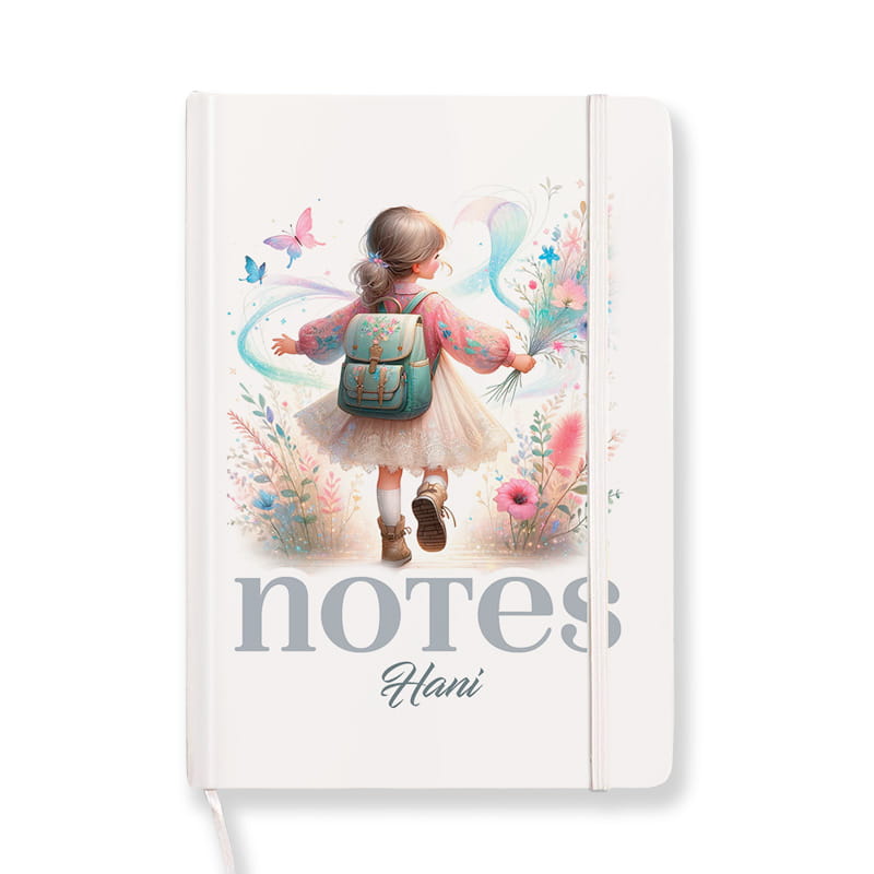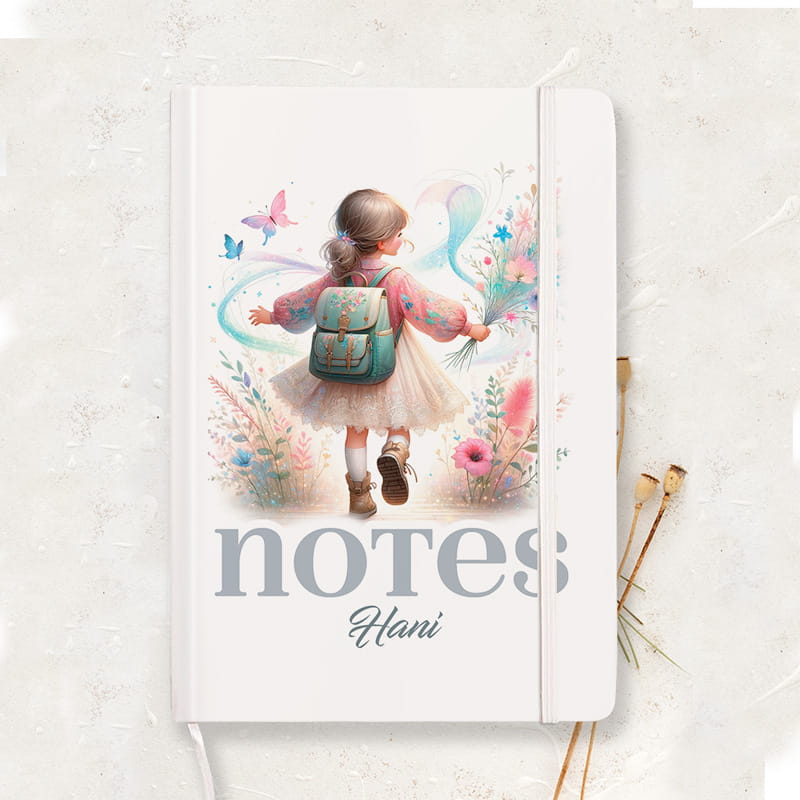 Okładka przedstawia dziewczynkę w sukience i z plecakiem, która z radością kroczy wśród kwiatów i kolorowych motyli. Kompozycja emanuje delikatnością, beztroską i dziecięcą magią, a pastelowe barwy tworzą bajkowy klimat, który inspiruje i zachęca do twórczości. Personalizowany podpis nadaje notesowi wyjątkowo osobisty charakter. Dzięki temu staje się on czymś więcej niż tylko zeszytem a wręcz jej własną prywatną przestrzenią.
