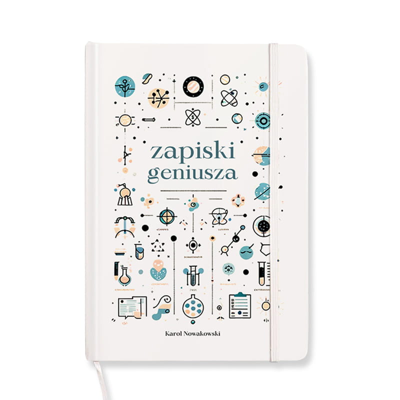 Personalizowany notatnik z imieniem i napisem "zapiski geniusza" to idealny prezent dla młodego naukowca. Pełen ikon naukowych, praktyczny i inspirujący – doskonały do badań, notatek i kreatywnych pomysłów.