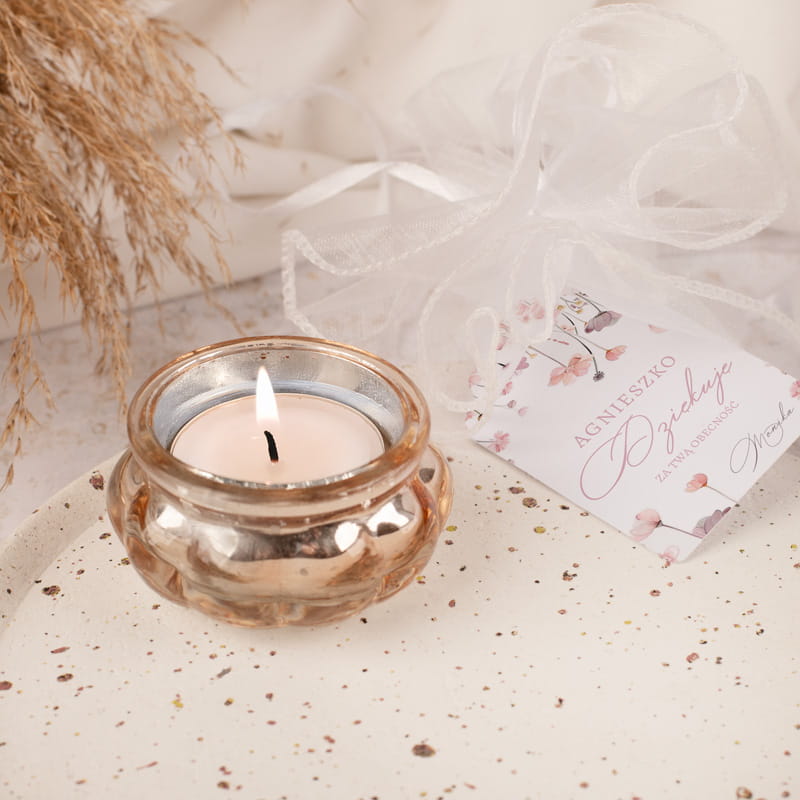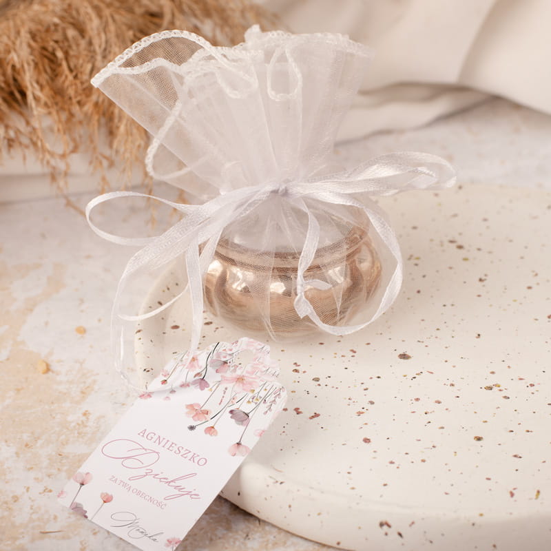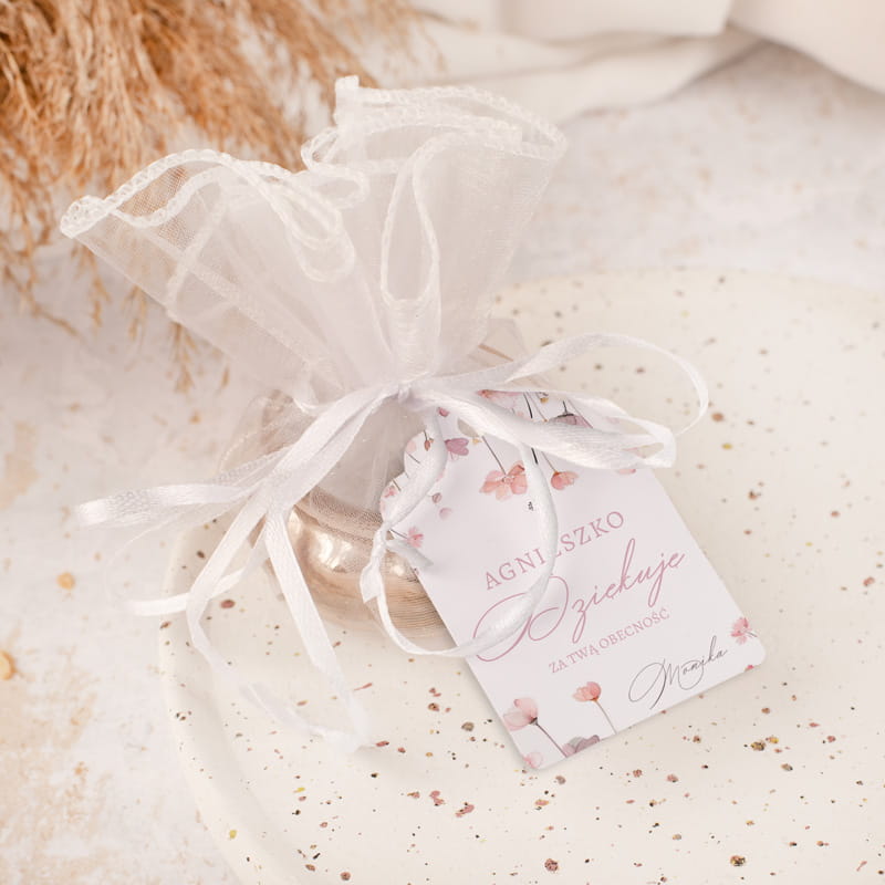 Szklany świecznik z miejscem na świeczkę zapakowany w delikatny materiał z organzy. Całość dopełnia bilecik z imieniem i napisem „Dziękuję za Twoją obecność”. Dodatkowo pod napisem umieszczony zostanie podpis. Ten drobny, ale przemyślany upominek z pewnością wywoła uśmiech. Szklany elegancki świecznik idealnie wpisuje się w klimat kobiecych przyjęć, a dzięki swojej uniwersalnej formie pasuje do każdej aranżacji wieczoru panieńskiego – zarówno plenerowego, jak i zorganizowanego w domu czy restauracji.