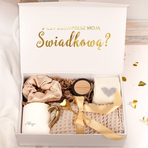 Eleganckie pudełko prezentowe z magnetycznym zamknięciem i napisem „Czy zostaniesz moją Świadkową?” w złoceniu