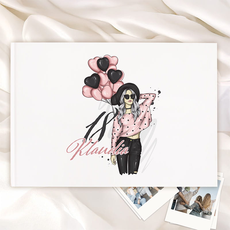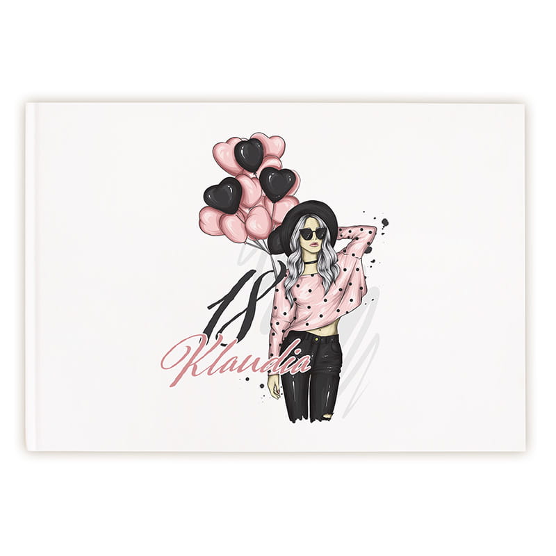 Personalizowana księga gości na 18 urodziny to wyjątkowy sposób na zachowanie wspomnień z jednego z najważniejszych dni w życiu nastolatki. Biała oprawa prezentuje się nowocześnie i estetycznie. Na okładce znajduje się modna ilustracja dziewczyny z długimi, włosami, w różowej bluzce w czarne kropki, czarnym kapeluszu i okularach przeciwsłonecznych. Obok niej unoszą się balony w kształcie serc w kolorze pudrowego różu i czerni. Kolorystyka projektu utrzymana jest w spójnych, modnych barwach: różu, czerni i bieli – dzięki temu całość wygląda kobieco, świeżo i stylowo.