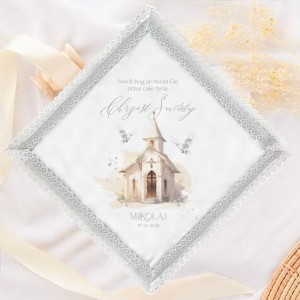 Personalizowana szatka na Chrzest Święty z elegancką szarą lamówką oraz subtelną, białą koronką to wyjątkowy element ceremonii, który z powodzeniem łączy w sobie delikatną estetykę z duchowym znaczeniem sakramentu. Uszyta z jasnej tkaniny o delikatnym połysku, szatka prezentuje się elegancko i świetnie wpisuje się w charakter uroczystości. Centralnym punktem szatki jest piękna grafika – akwarelowy kościółek z wieżyczką, utrzymany w przytulnych odcieniach beżu, piasku i kremu. Nad świątynią unoszą się dwie białe gołębice, będące symbolicznym przedstawieniem obecności Ducha Świętego i jego opieki nad dzieckiem. Powyżej tej ilustracji umieszczono cytat: