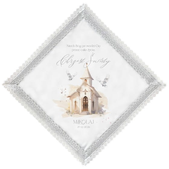 Szatka na Chrzest z personalizacją w postaci imienia i daty, ozdobiona szarą lamówką i delikatną, białą koronką z grafiką kościółka i gołębi.