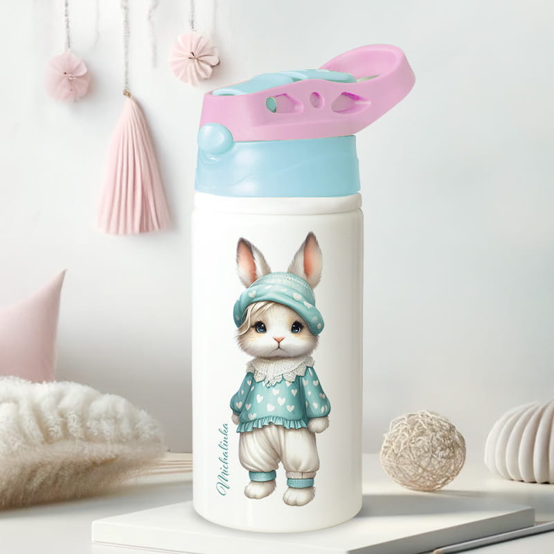 Personalizowany bidon z ustnikiem dla dziewczynki – 500 ml. Uroczy króliczek i imię dziecka sprawiają, że jest to idealny prezent na urodziny, do przedszkola i na codzienne przygody.