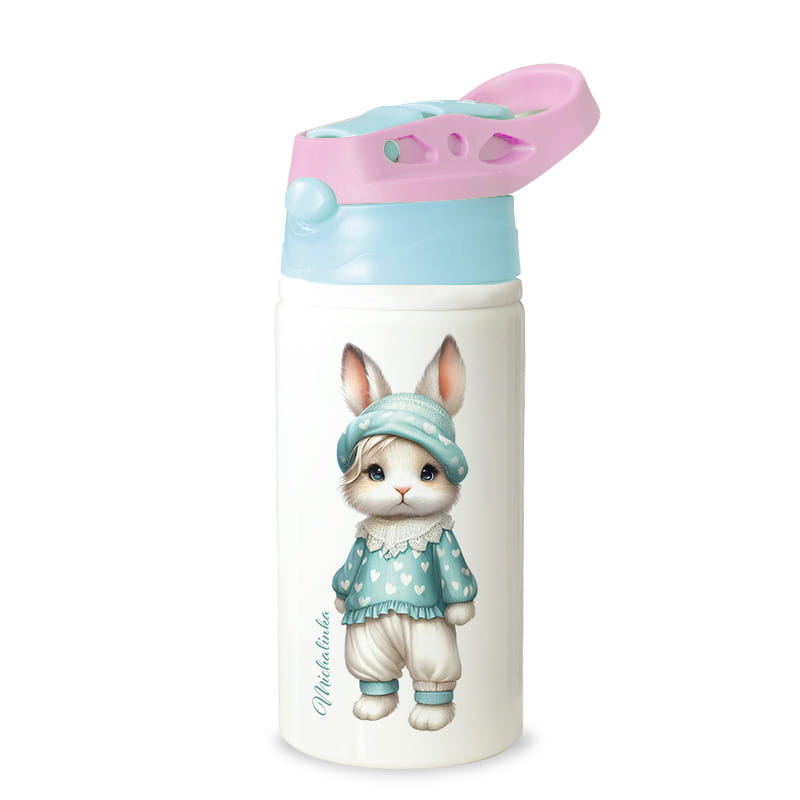 Bidon o pojemności 500 ml został zaprojektowany z myślą o najmłodszych, którzy uwielbiają otaczać się bajkowymi motywami i rzeczami stworzonymi specjalnie dla nich. Na jego przedniej ściance znajduje się króliczek w miętowym ubranku w serduszka, czapeczce i białych spodniach wyglądający jak wyjęty z ilustracji książki dla dzieci. Obok zwierzątka znajduje się delikatny napis z imieniem dziecka co sprawia, że bidon staje się wyjątkowy i osobisty.