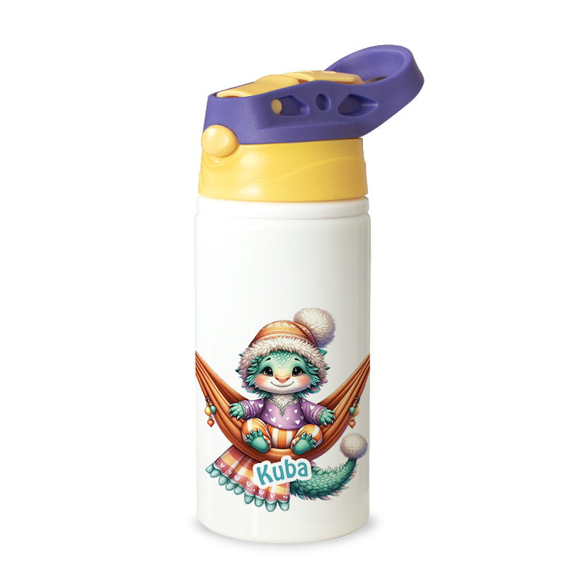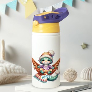 Na butelce znajduje się urocza postać siedząca wygodnie w hamaku, ubrana w zimową czapkę i kolorowy sweterek. Całość dopełnia delikatny nadruk z imieniem dziecka, który sprawia, że butelka staje się niepowtarzalna i osobista.