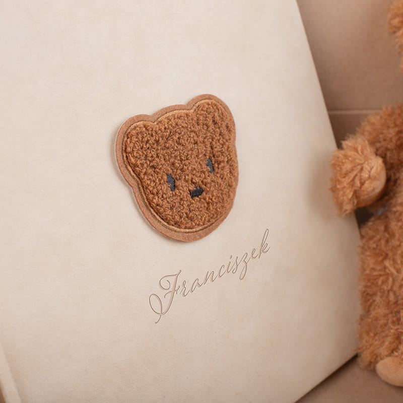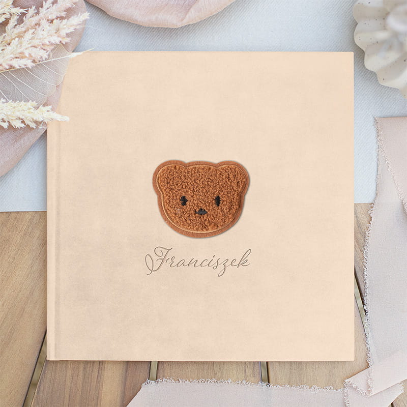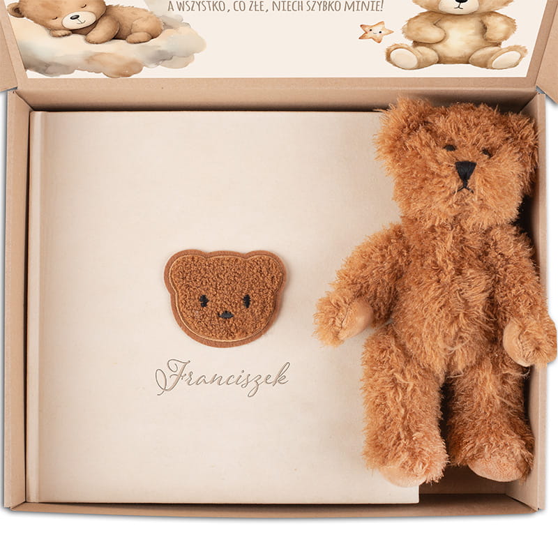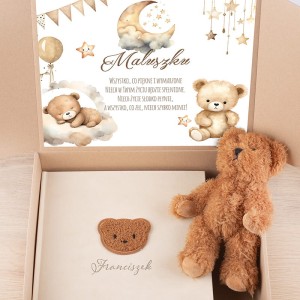 Zestaw prezentowy z personalizowanym albumem i pluszowym misiem to idealny prezent na narodziny, baby shower lub chrzest. Elegancka pamiątka i uroczy towarzysz maluszka w jednym.