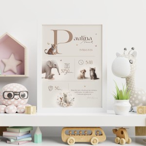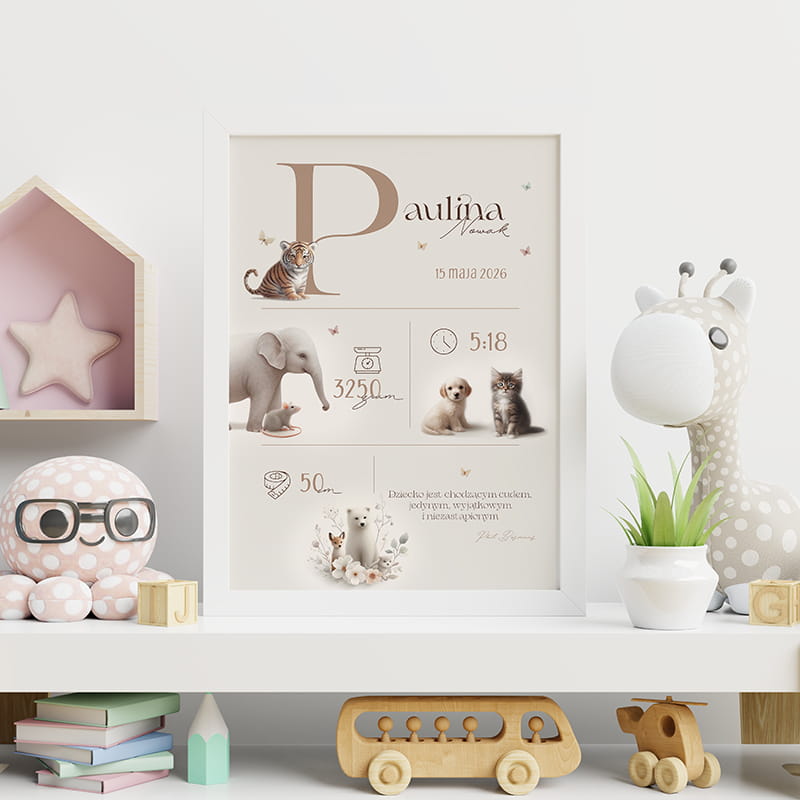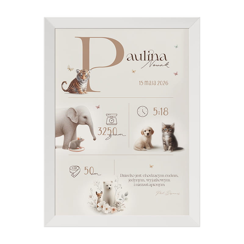 Ramka z metryczką i inicjałem dziecka to pamiątka, która pozwala zatrzymać wspomnienie najpiękniejszego dnia – narodzin ukochanego maluszka. Umieszczony wewnątrz plakat łączy delikatną grafikę z personalizowanymi informacjami, tworząc estetyczny, a zarazem osobisty element wystroju dziecięcego pokoiku. W centralnej części znajduje się duży ozdobny inicjał oraz pełne imię i nazwisko dziecka, a poniżej szczegóły z metryczki: data urodzenia, godzina narodzin, waga i długość maluszka. Całość została oprawiona w urocze ilustracje zwierzątek i motyli, które wprowadzają ciepły, bajkowy klimat – idealny do wnętrza urządzonego z troską i miłością.
