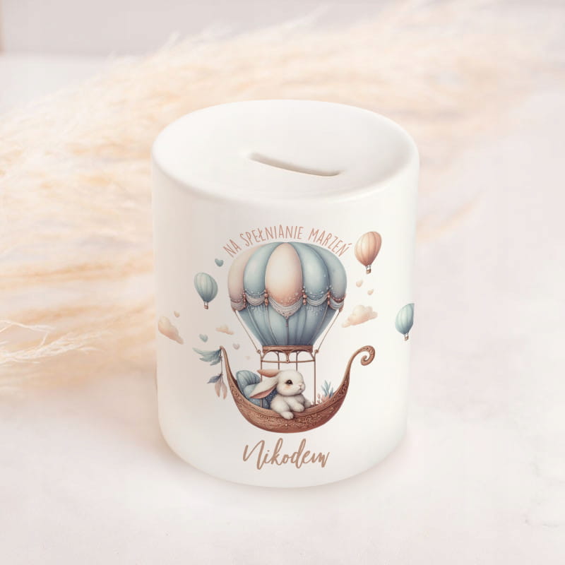 Delikatna i elegancka ceramiczna skarbonka z imieniem, która od pierwszych dni życia dziecka będzie towarzyszyć mu w odkrywaniu wartości oszczędzania i realizacji małych oraz dużych marzeń. Skarbonka została ozdobiona uroczą grafiką przedstawiającą króliczka siedzącego w ozdobnej gondoli unoszonej przez pastelowy balon. W tle unoszą się baloniki i lekkie obłoczki, które nadają całości bajkowego i przytulnego charakteru.