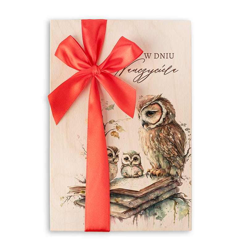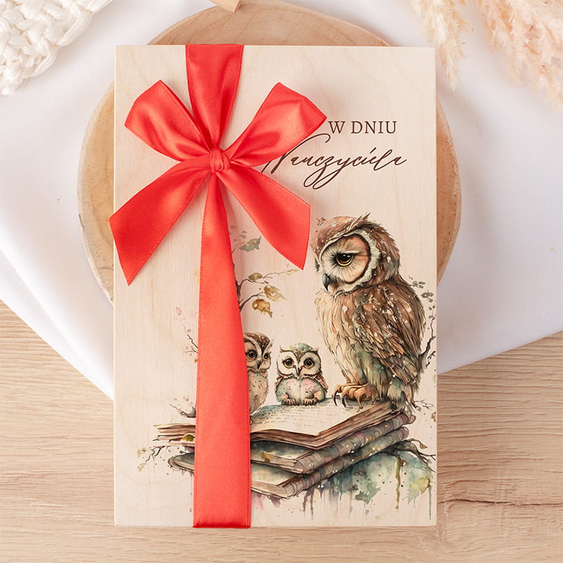 Drewniana skrzynka z elegancką grafiką sowy i czerwoną wstążką to wyjątkowy prezent na Dzień Nauczyciela, wypełniony słodką czekoladą oraz stylowym długopisem.