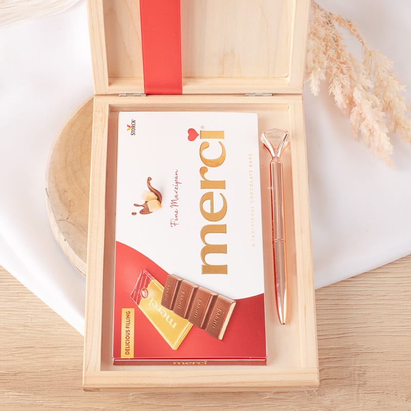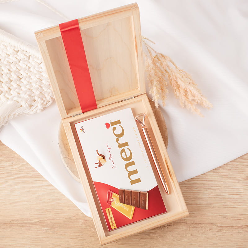 Skrzynka prezentowa na Dzień Nauczyciela to elegancki sposób, aby podziękować za trud, cierpliwość i codzienne zaangażowanie pedagoga. Wykonana z naturalnego drewna, zdobiona efektownym nadrukiem z motywem sowy oraz przewiązana czerwoną satynową wstążką, prezentuje się wyjątkowo estetycznie i od razu gotowa jest do wręczenia. Wewnątrz znajduje się zestaw drobiazgów, które łączą elegancję i słodycz – klasyczna tabliczka czekolady Merci oraz metaliczny długopis ozdobiony kryształkiem.