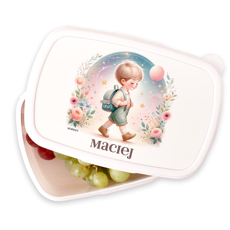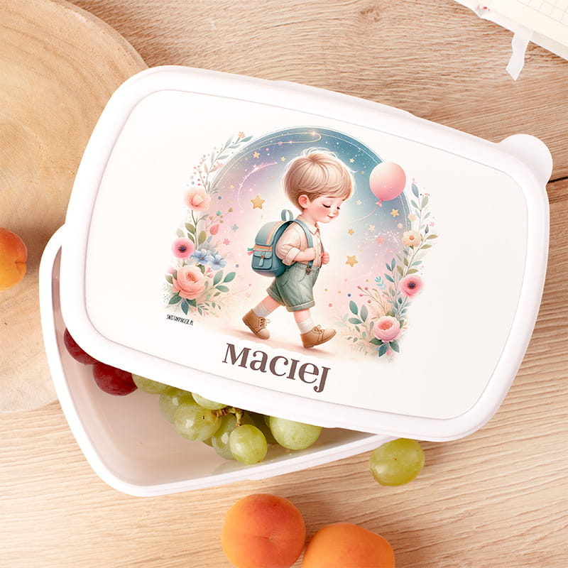 Na wieczku znajduje się subtelna, bajkowa ilustracja przedstawiająca chłopca z plecakiem, który spaceruje wśród kwiatów, gwiazd i pastelowego nieba. Uroku całej kompozycji dodaje balonik unoszący się nad jego głową oraz delikatne tło pełne marzeń i dziecięcej radości. Imię dziecka nadrukowane pod grafiką sprawia, że każdy pojemnik staje się niepowtarzalny i wyjątkowy.