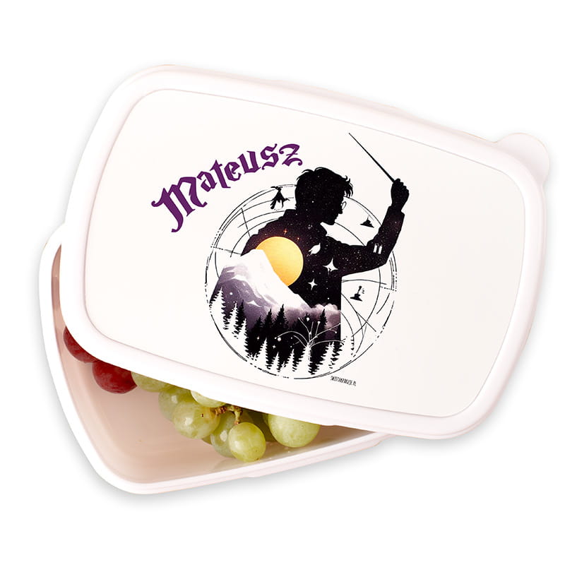 Na pokrywce widnieje tajemniczy, mroczny motyw inspirowany stylistyką uniwersum Harry’ego Pottera – sylwetka młodego czarodzieja z uniesioną różdżką, tło z księżycem, górami, lasem i magicznymi detalami, które przywodzą na myśl zaklęcia, eliksiry i niesamowite przygody. Gotycki font użyty do zapisania imienia dodaje całości klimatu rodem z komnat Hogwartu. To nie tylko pudełko na kanapki – to codzienna dawka czarodziejskiej atmosfery.