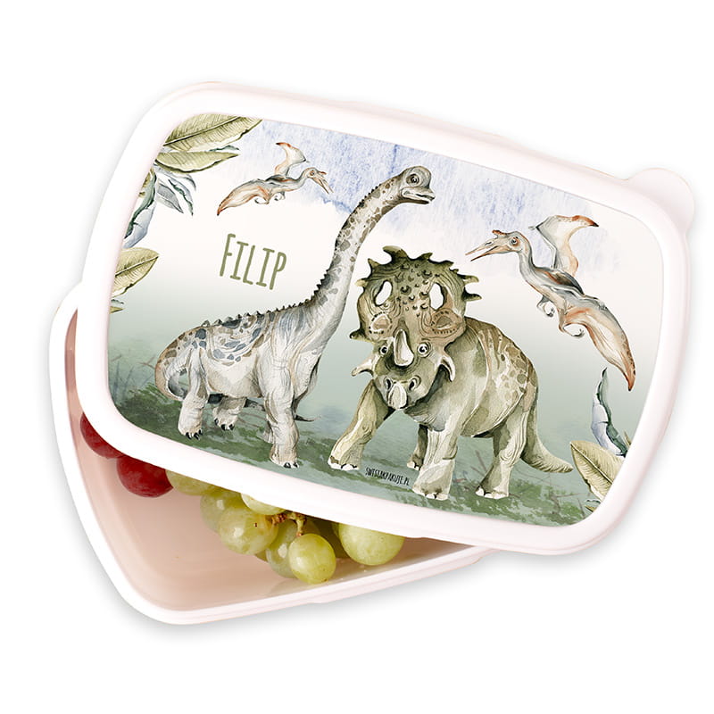 Na pokrywce śniadaniówki znajdują się realistyczne, akwarelowe ilustracje dinozaurów. Tło uzupełniają tropikalne liście i neutralne barwy, które nadają całości naturalny, przygodowy charakter. Imię dziecka wkomponowane w grafikę sprawia, że pudełko nabiera osobistego charakteru i od razu wyróżnia się wśród innych, nawet na zatłoczonym szkolnym stole.