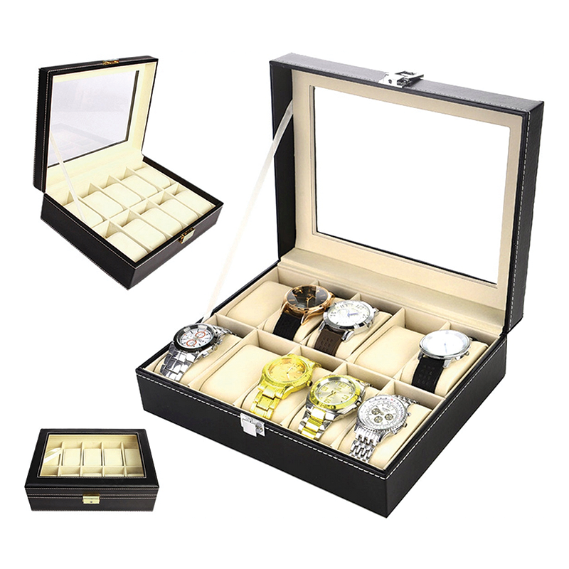 Wnętrze organizera mieści 10 przegródek z jasnymi, miękkimi poduszkami, które chronią zegarki przed zarysowaniami i pozwalają na ich estetyczną ekspozycję. Szklane wieko zabezpiecza kolekcję przed kurzem, a jednocześnie umożliwia jej podziwianie bez otwierania szkatułki.