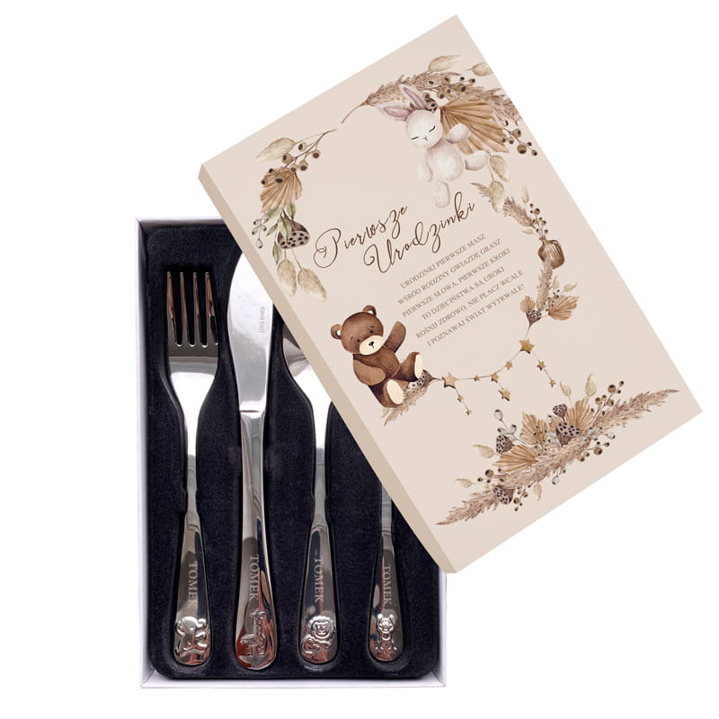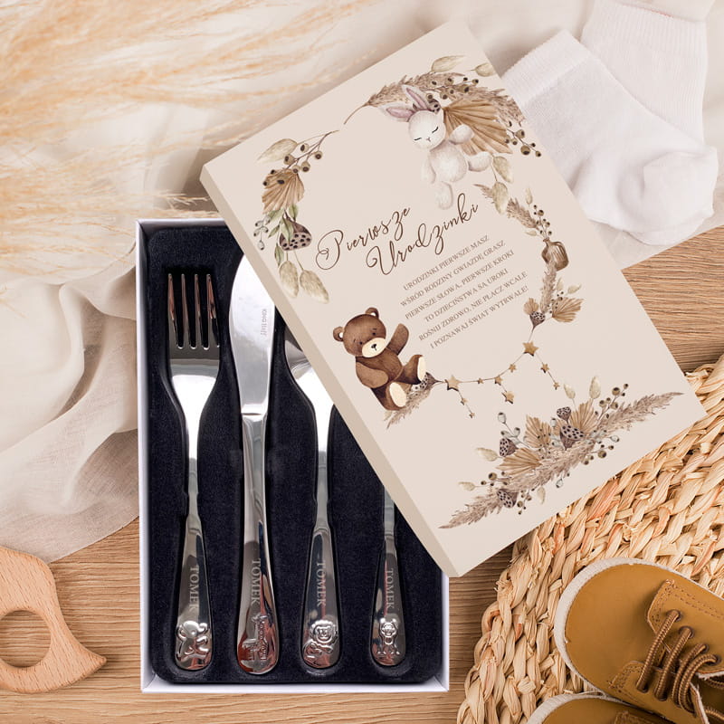 W zestawie znajdują się cztery sztućce – widelec, nóż, łyżka i łyżeczka – wykonane z trwałej, wysokiej jakości stali nierdzewnej, idealnej dla dzieci. Każdy z elementów został dopracowany w najdrobniejszym szczególe, a na rękojeściach widoczne są subtelne wypukłe wzory z motywami dziecięcymi. Najważniejszym detalem jest grawer z imieniem dziecka, który dodaje zestawowi osobistego charakteru. Wszystko to zamknięte jest w eleganckim pudełku z napisem „Pierwsze Urodzinki” oraz delikatną ilustracją z misiem i króliczkiem w tonacji beżu i brązu.