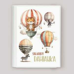 Na okładce widzimy tygryska unoszącego się w balonie, obok którego dryfują inne zwierzęta – słoń, zebra i żyrafa – każda z nich w swoim kolorowym balonie.