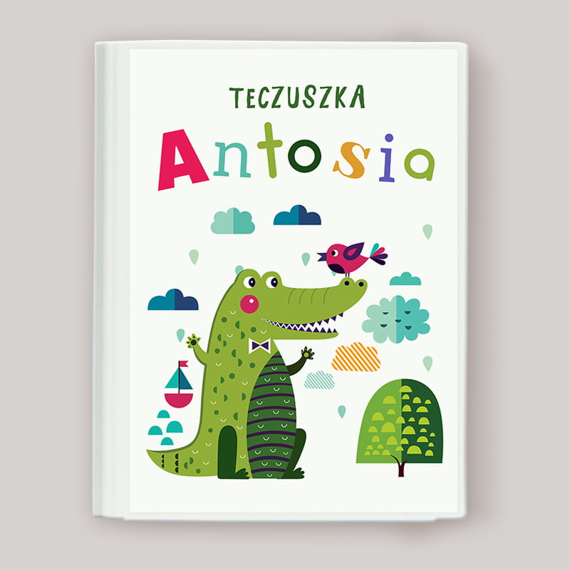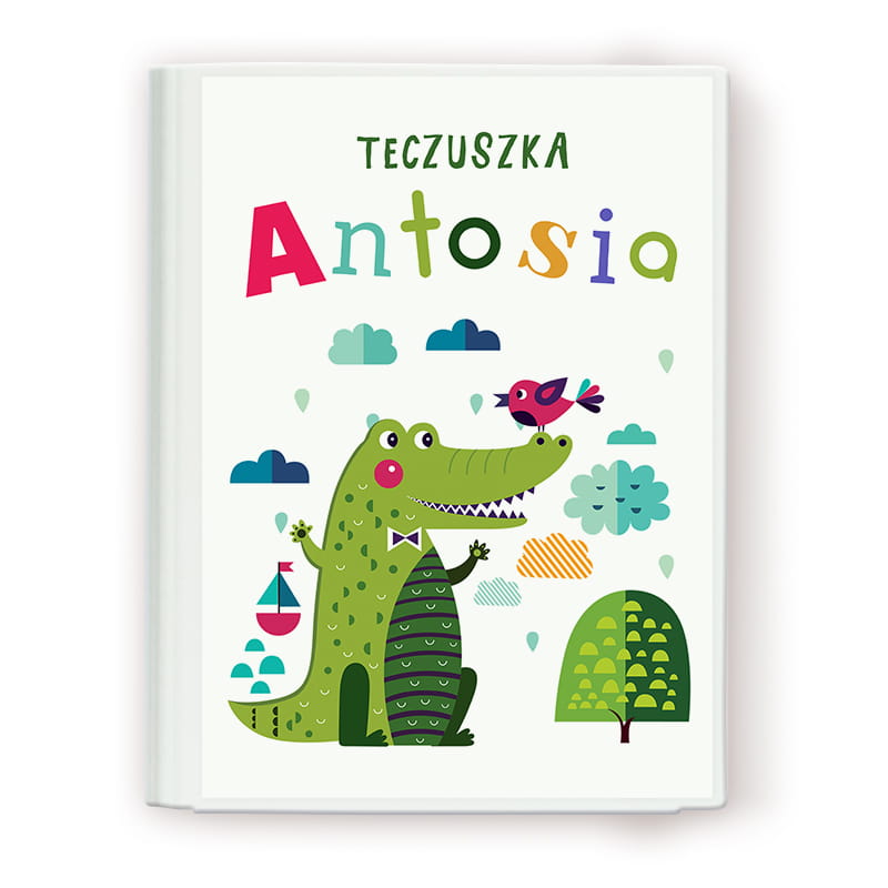 Personalizowana teczka na rysunki z bajkową grafiką krokodyla. Idealna do przechowywania prac plastycznych. Świetny pomysł na prezent i naukę organizacji.