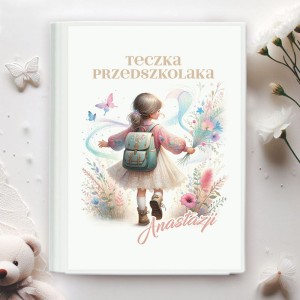 Teczka została zaprojektowana z myślą o dziewczynkach – subtelna grafika z pastelowymi barwami, kwiatami i motylami zachwyci każde dziecko. Na okładce znajduje się urocza ilustracja dziewczynki z plecaczkiem, otoczonej kwitnącymi roślinami i magiczną atmosferą, co nadaje całości bajkowego charakteru. Nadruk imienia wykonany estetyczną, kobiecą czcionką dodaje personalnego uroku i podkreśla indywidualność właścicielki.