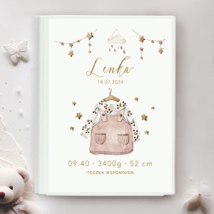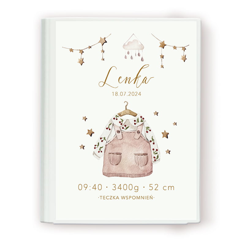 Na okładce teczki znajduje się subtelna ilustracja dziecięcego ubranka – różowej sukienki na szelkach i bluzeczki we wzór gałązek. Obok grafiki umieszczane jest imię dziecka, data urodzin, godzina urodzin, waga i wzrost.