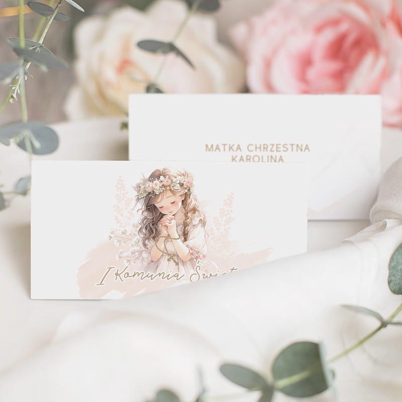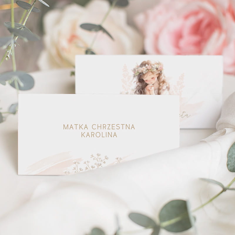 Dzięki niej każdy z zaproszonych czuje się doceniony i mile widziany. Produkt pełni funkcję informacyjną, a jednocześnie wzrusza swoją formą. Winietka zawiera imię, co znacznie ułatwia organizację miejsc przy stole. Ozdobiona jest pastelową grafiką dziewczynki w komunijnym stroju. Subtelne kolory i elegancka typografia wprowadzają odświętny klimat.