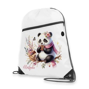 Na froncie worka znajduje się czarno-biała panda siedząca na gałęzi, trzymająca w łapkach tabliczkę czekolady. Uroczy charakter postaci podkreślają dodatki: różowy szalik owinięty wokół szyi, kwiaty we włosach i subtelne motywy roślinne, które otaczają zwierzątko. Obok ilustracji, znajduje się spersonalizowane imię właścicielki, co czyni ten worek niezwykle osobistym i łatwym do zidentyfikowania, na przykład w szatni na basenie.