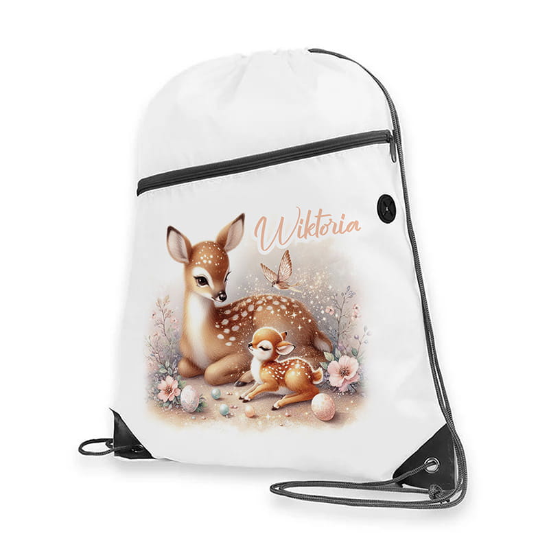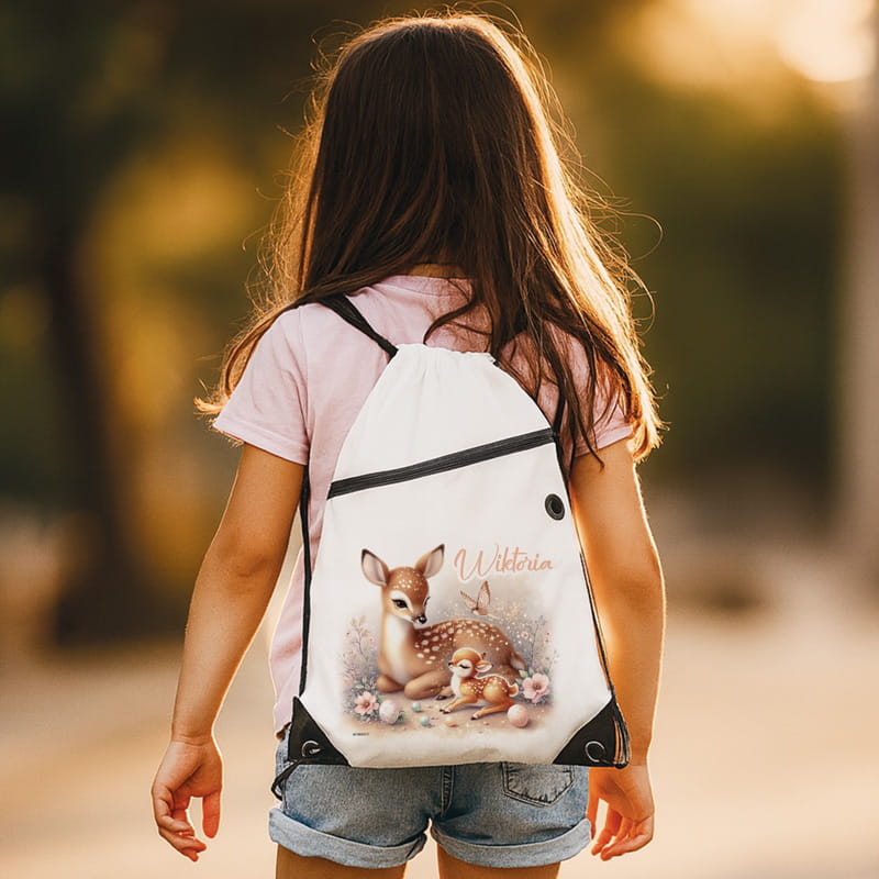 Na froncie worka znajduje się urocza grafika przedstawiająca dwa jelenie – mamę i małe jelonki – odpoczywające wśród kwiatów, motyli i pastelowych dekoracji. Scena jest ciepła, spokojna i pełna dziecięcej delikatności. Grafika zachwyca subtelną kolorystyką i przyciąga uwagę swoim baśniowym charakterem. Obok ilustracji widnieje imię dziecka, co sprawia, że worek staje się niepowtarzalny i doskonale nadaje się na spersonalizowany prezent.