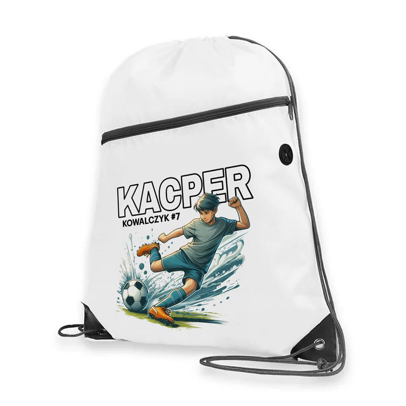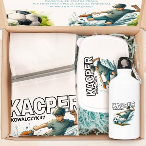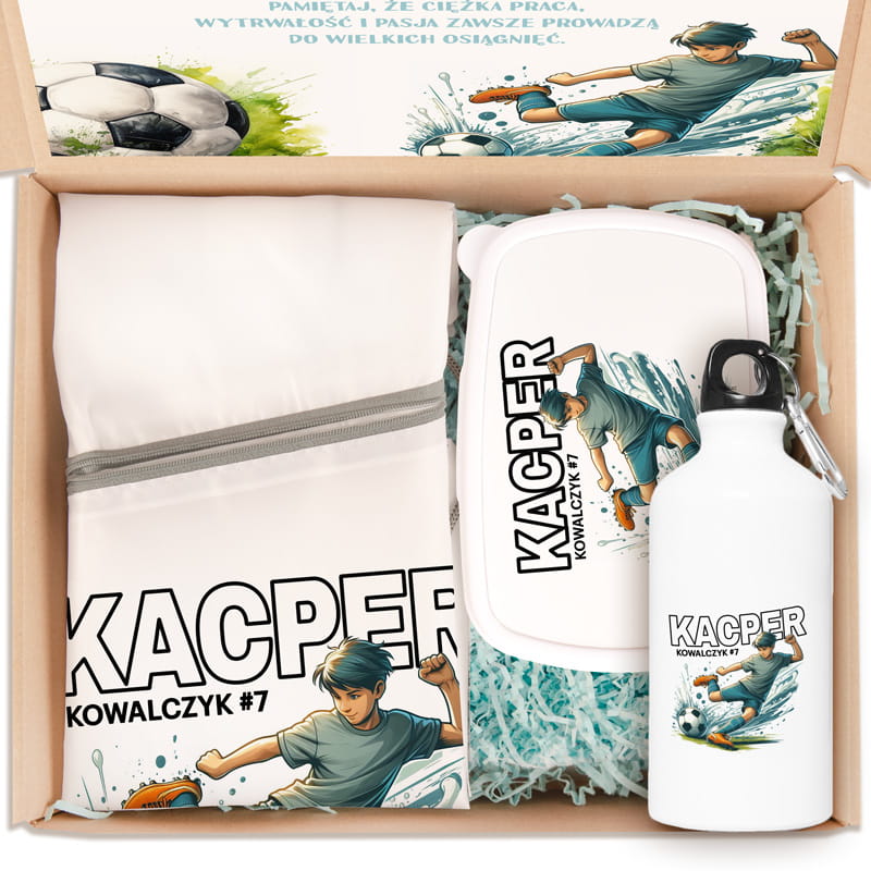 Całość tworzy spójny, personalizowany komplet, który nie tylko spełnia codzienne potrzeby szkolne i sportowe, ale również buduje w dziecku poczucie dumy z pasji, jaką jest piłka nożna. Dzięki temu, że każdy element zawiera imię, nazwisko dziecka oraz numer z którym gra, dzięki czemu wyprawka staje się wyjątkowa i niepowtarzalna – trudno ją pomylić z innymi w szatni czy klasie.