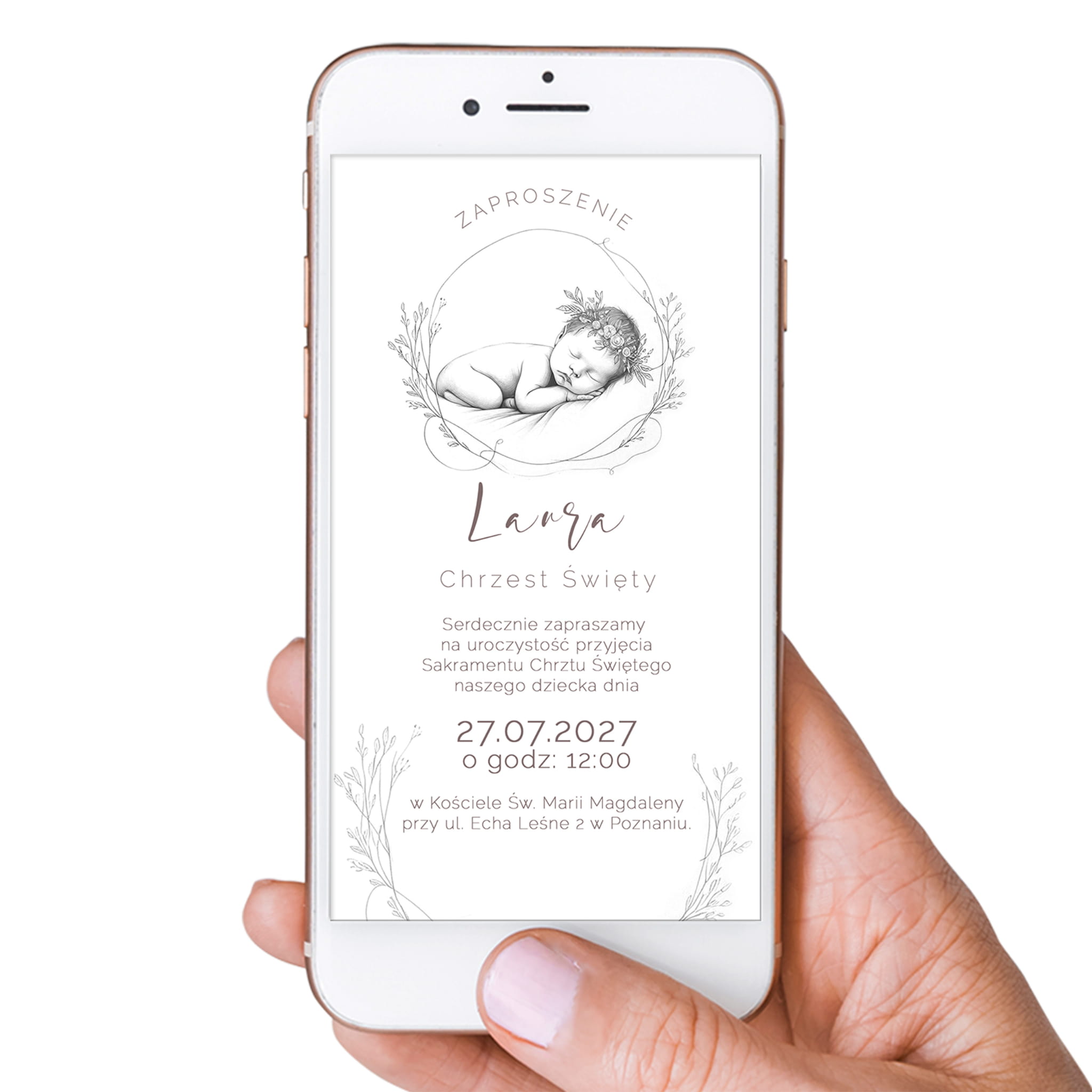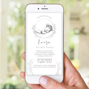 Elektroniczne zaproszenie na Chrzest Święty w minimalistycznym stylu to subtelna i elegancka forma przekazania informacji o tym ważnym wydarzeniu. Zaprojektowane z myślą o estetyce i prostocie, zachwyca delikatną grafiką przedstawiającą śpiące niemowlę otoczone florystycznym wieńcem.