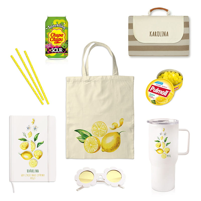 Cytrynowy zestaw prezentowy z personalizacją to energetyczny prezent dla kobiety – z kubkiem termicznym, torbą, notatnikiem, kocem i słodkimi dodatkami. Idealny na lato!