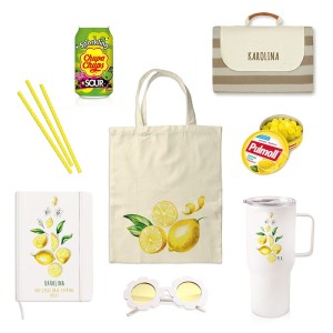 Zestaw zawiera także słodko-orzeźwiające dodatki: puszkę napoju gazowanego Chupa Chups Sour oraz cytrynowe cukierki Pulmoll. Zabawny i stylowy akcent stanowią okulary przeciwsłoneczne w kształcie kwiatków. Uzupełnieniem zestawu jest bawełniana torba z uchwytami i nadrukiem cytryn.