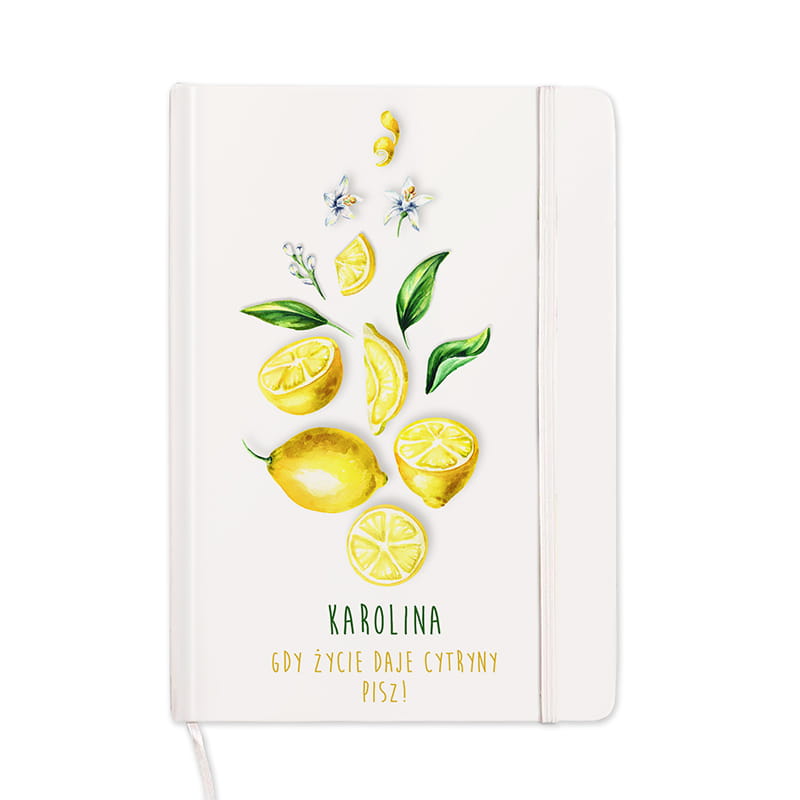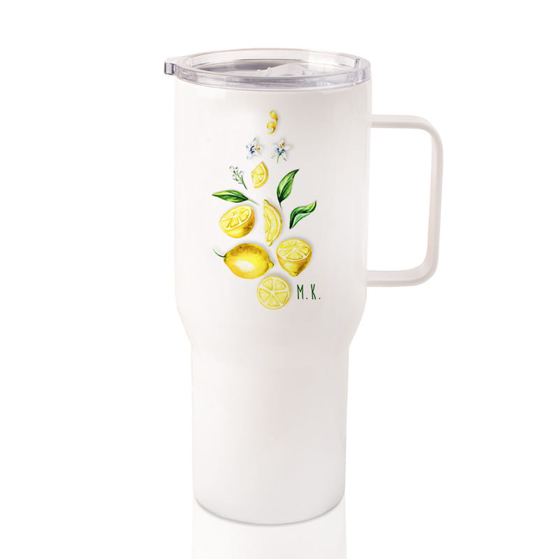 Kolejny element to pojemny kubek termiczny z inicjałami, który pozwala cieszyć się ulubionym napojem w idealnej temperaturze, niezależnie od pory dnia. Dzięki ergonomicznemu uchwytowi jest niezastąpiony w pracy, podróży czy na pikniku. Kubek prezentuje się nowocześnie i subtelnie, zachwycając pastelowym nadrukiem cytryn.