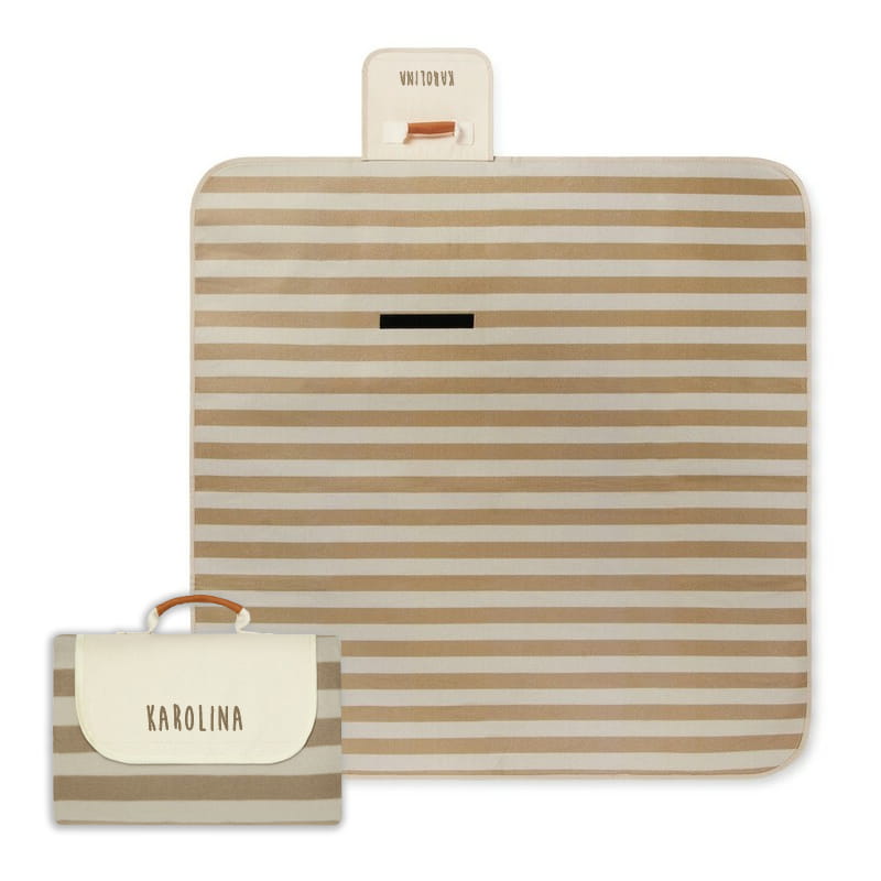 W jego skład wchodzi miękki, składany koc piknikowy z personalizacją, który idealnie nadaje się na letnie wyjścia do parku, plażę czy ogród. Jest lekki, poręczny i stylowy, dzięki czemu stanowi nie tylko funkcjonalny dodatek, ale i przyjemny akcent dekoracyjny. Obok niego znajduje się notatnik z cytrynowym motywem i imieniem właścicielki. To świetne miejsce na zapiski, notatki czy wakacyjne plany – stylowe i osobiste.