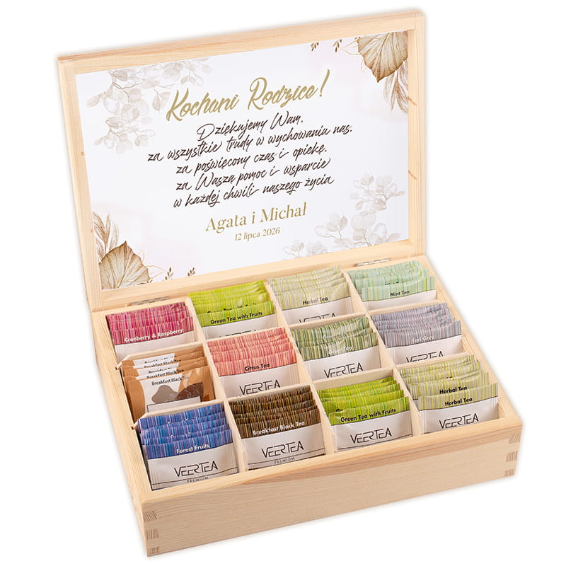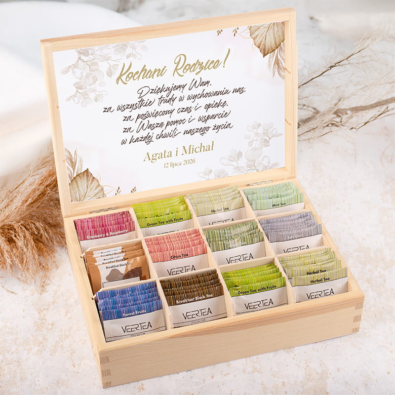 Drewniana skrzynka została wykonana z naturalnego drewna. Jej wnętrze skrywa mix saszetek herbat, starannie dobrane tak, by trafić w różnorodne gusta. Znajdziemy tu różne smaki herbat, które uprzyjemnią każdy poranek lub wieczorną chwilę relaksu. Wnętrze skrzyni zostało ozdobione wklejką z piękną roślinną grafiką i personalizowanym podpisem. W środku umieszczone zostaną imiona pary młodej i data uroczystości, dzięki czemu personalizowane podziękowanie dla rodziców nabiera wyjątkowego charakteru.