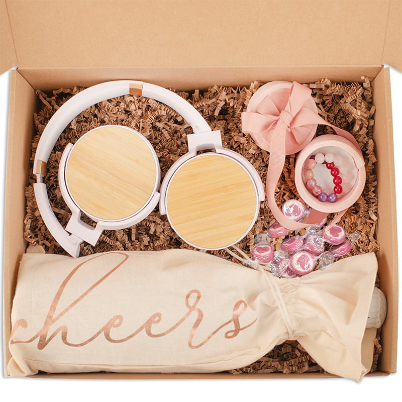Zestaw prezentowy dla dziewczyny ze słuchawkami to elegancka kompozycja praktycznych gadżetów, słodkich dodatków i bezalkoholowego wina musującego w ozdobnym pudełku.