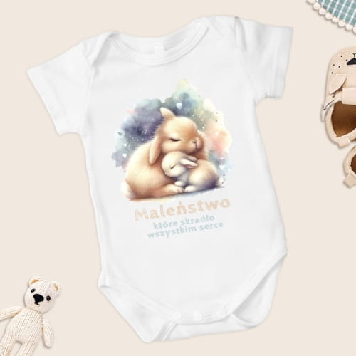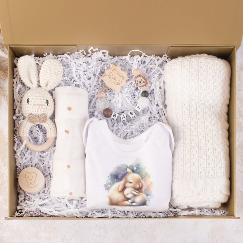 W zestawie znajdziesz miękki, dzianinowy kocyk, który otuli maluszka podczas snu i zapewni mu komfort zarówno w domu, jak i w czasie spacerów. Urocze body z nadrukiem króliczka dodaje całości dziecięcego uroku i świetnie sprawdzi się w codziennym użytkowaniu. W komplecie znajduje się również drewniany gryzak w kształcie króliczka – bezpieczny i przyjazny dla maluszka w okresie ząbkowania. Subtelna pieluszka z delikatnym wzorem to praktyczny dodatek, który znajdzie wiele zastosowań, a drewniana zawieszka do smoczka zapobiegnie jego zgubieniu, jednocześnie pełniąc funkcję ozdobną.