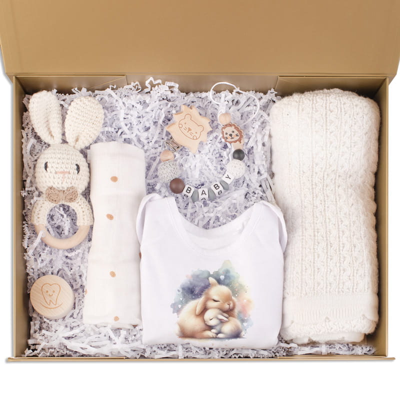 Całość zapakowana jest w eleganckie pudełko z personalizacją, dzięki czemu prezent nabiera unikalnego charakteru i od razu jest gotowy do wręczenia. To propozycja idealna na baby shower, pierwszą wizytę u maluszka czy prezent z okazji narodzin. Taki zestaw to połączenie wzruszenia, pięknego stylu i codziennej użyteczności, które na długo pozostanie w pamięci obdarowanych.