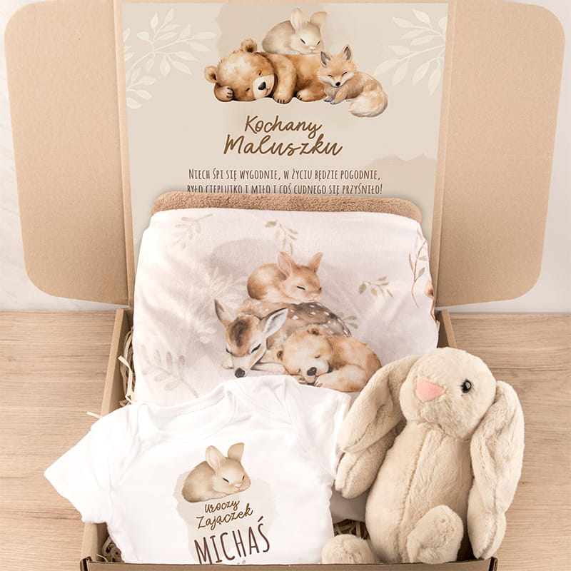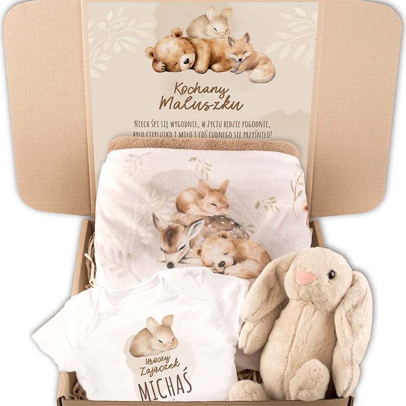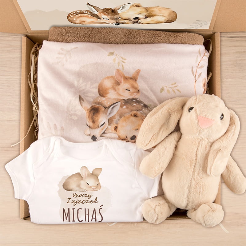 Zestaw prezentowy dla maluszka zawiera personalizowany otulacz z imieniem, pluszowego zajączka i drewniane serduszko w ozdobnym pudełku z życzeniami.